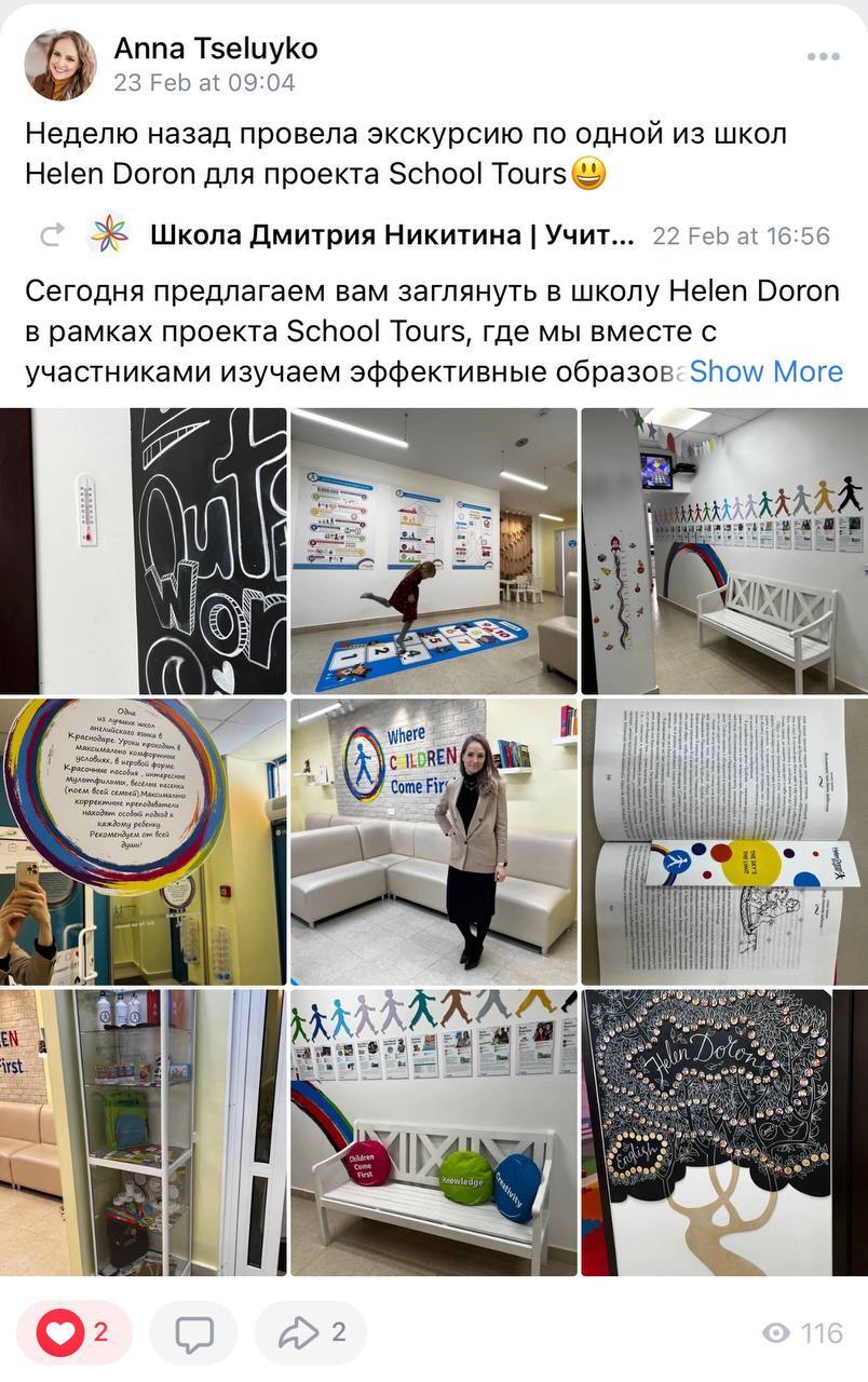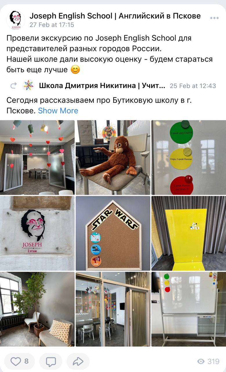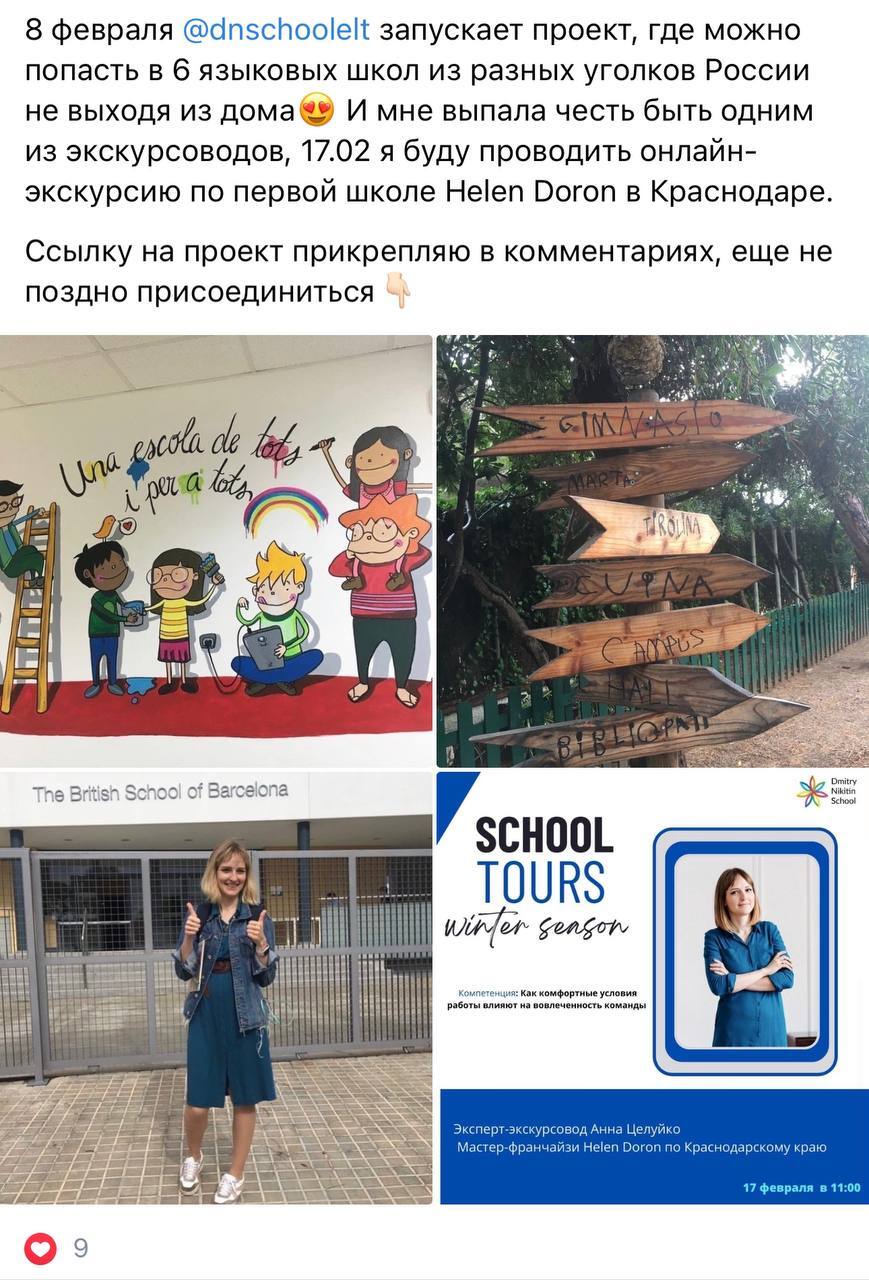 Вы сможете присутствовать на 6 онлайн-экскурсиях. Это уникальная возможность не только посмотреть новую языковую школу, но и поговорить с её владельцем после экскурсии.
