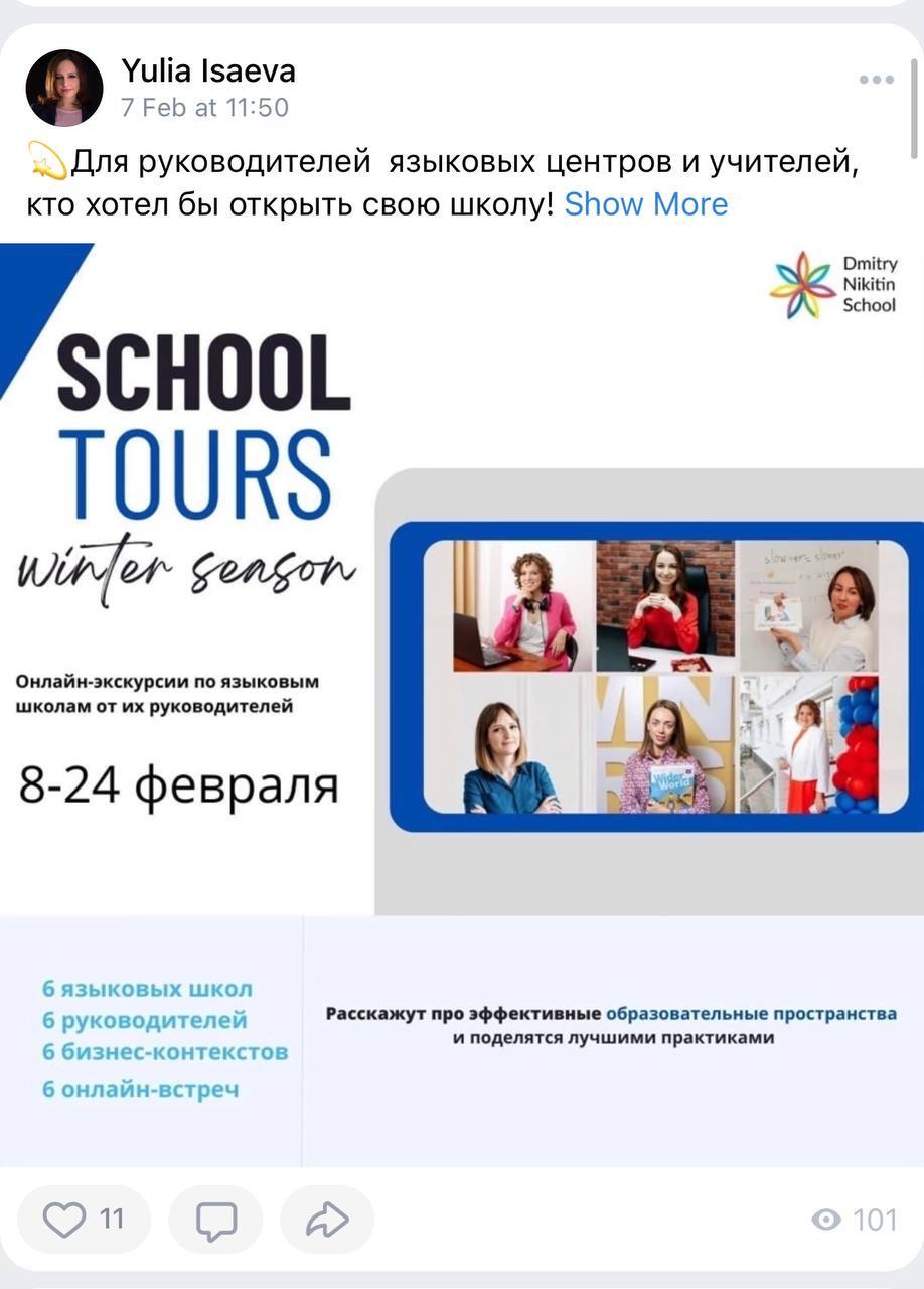 Онлайн-курс Экскурсии по языковым школам от их руководителей – 6 онлайн встреч для владельцев языковых школ, организуемый ИП Никитин Д.С. с 26 октября 2022 года по 11 ноября 2022 года.
